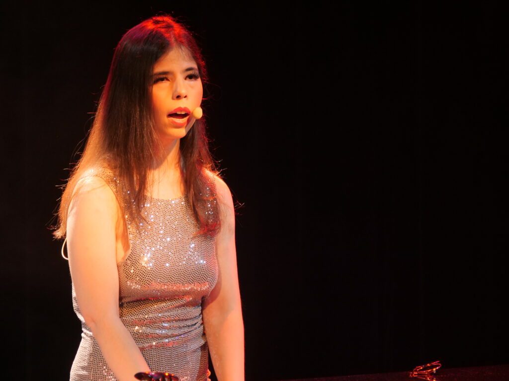 Sa façon de s’exprimer est plaisante, sa voix parlée également. Elle sait interagir avec les spectateurs et s’en fait immanquablement des complices.